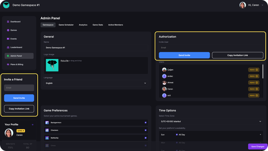Invite via Admin Panel: Go to Admin Panel > Gamespace and use the Invite User section under Authorization.