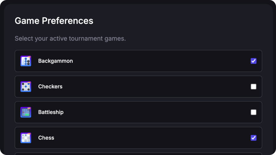 Easily adjust which games are available in your Gamespace by checking or unchecking boxes. If a game is unchecked, it will no longer appear on the Games page, and users wonโt be able to play it.