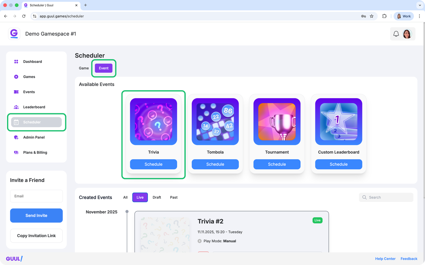 To create a new Trivia event, click Schedule under the Trivia card.