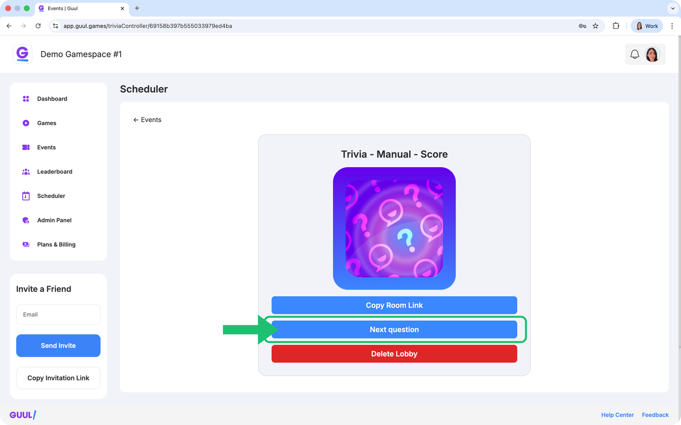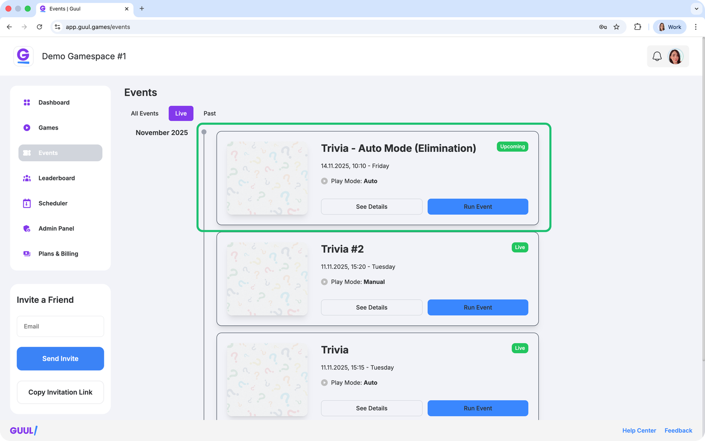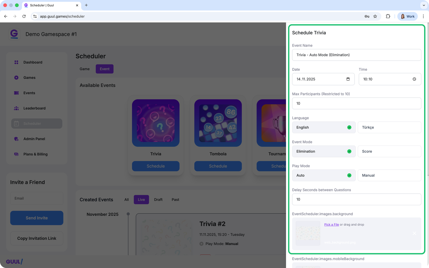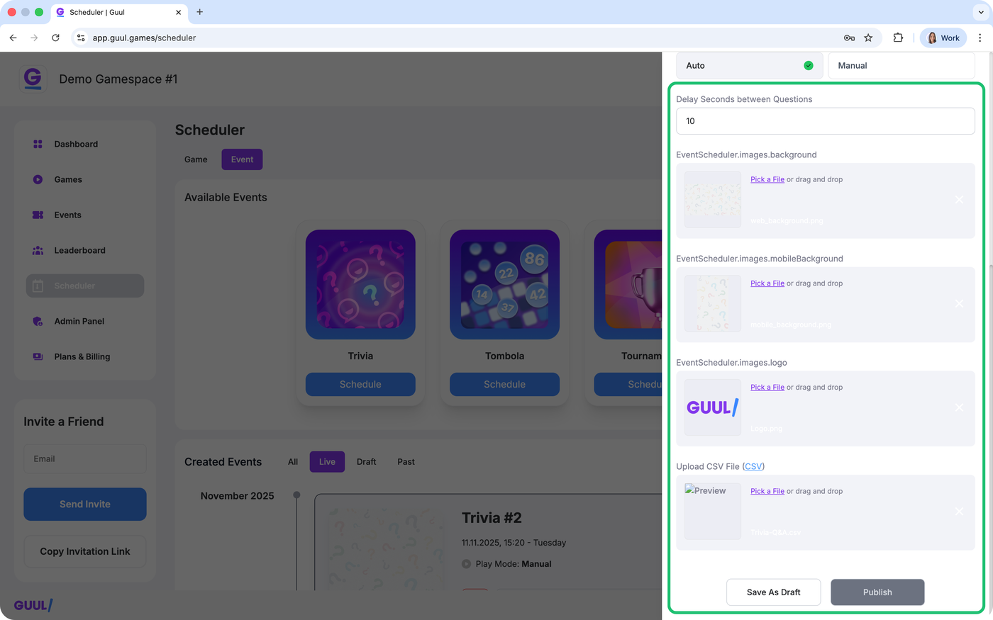 This guide explains every step of creating and running a Trivia event in your Gamespace — from scheduling and uploading your questions to launching and managing the event.