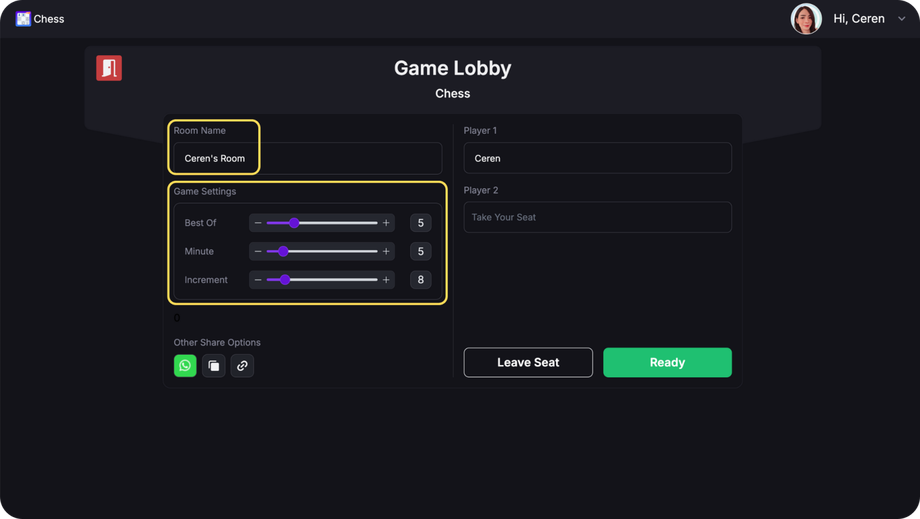 As the creator, you’ll automatically be Player 1 and can adjust the Room Name and Game Settings. You can leave your seat or take other seats.