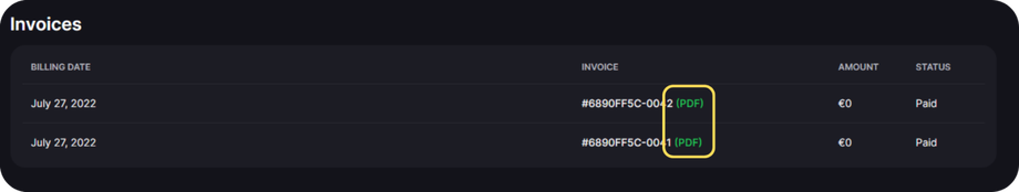 In the Invoices tab, you can view all of your previous invoices. To download an invoice, simply click the PDF button next to the relevant invoice.
