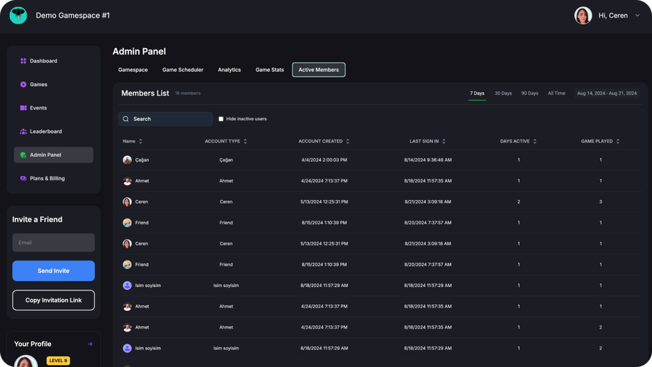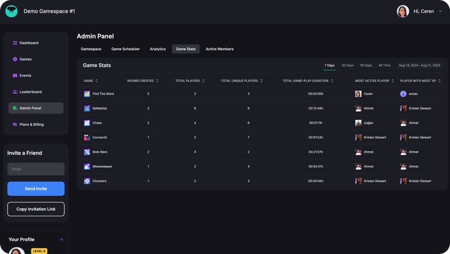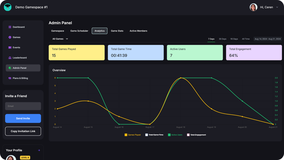 Gaming analytics involves using user behavior data to guide decisions related to community engagement, user retention, and service performance. Guul provides administrators with tools to track and analyze their Gamespace’s performance and user activity. By utilizing the Analytics, Game Stats, and Active Members tabs, admins can visualize data and identify opportunities to enhance engagement, participation, and retention among users.