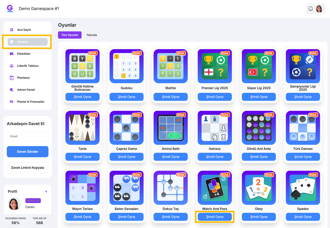 Oyunlar Sayfasına Gidin: Sol menüden Oyunlar sekmesine tıklayın. Burada Guul’da oynayabileceğiniz tüm oyunları görebilirsiniz.