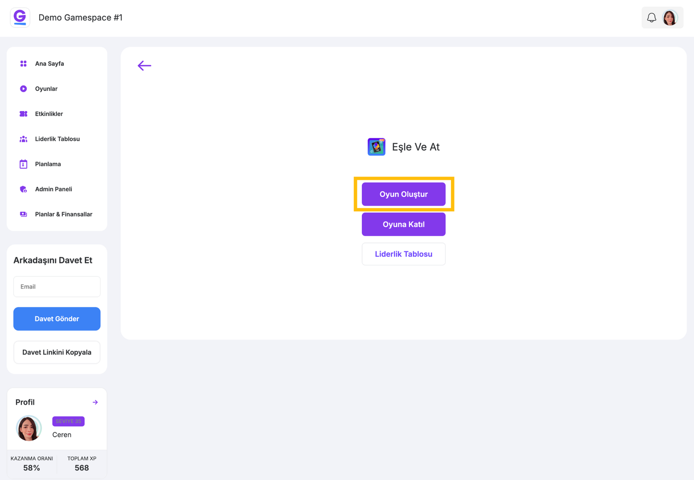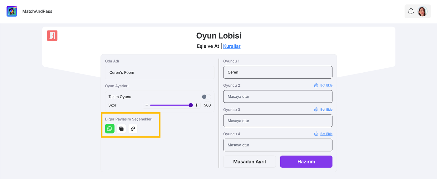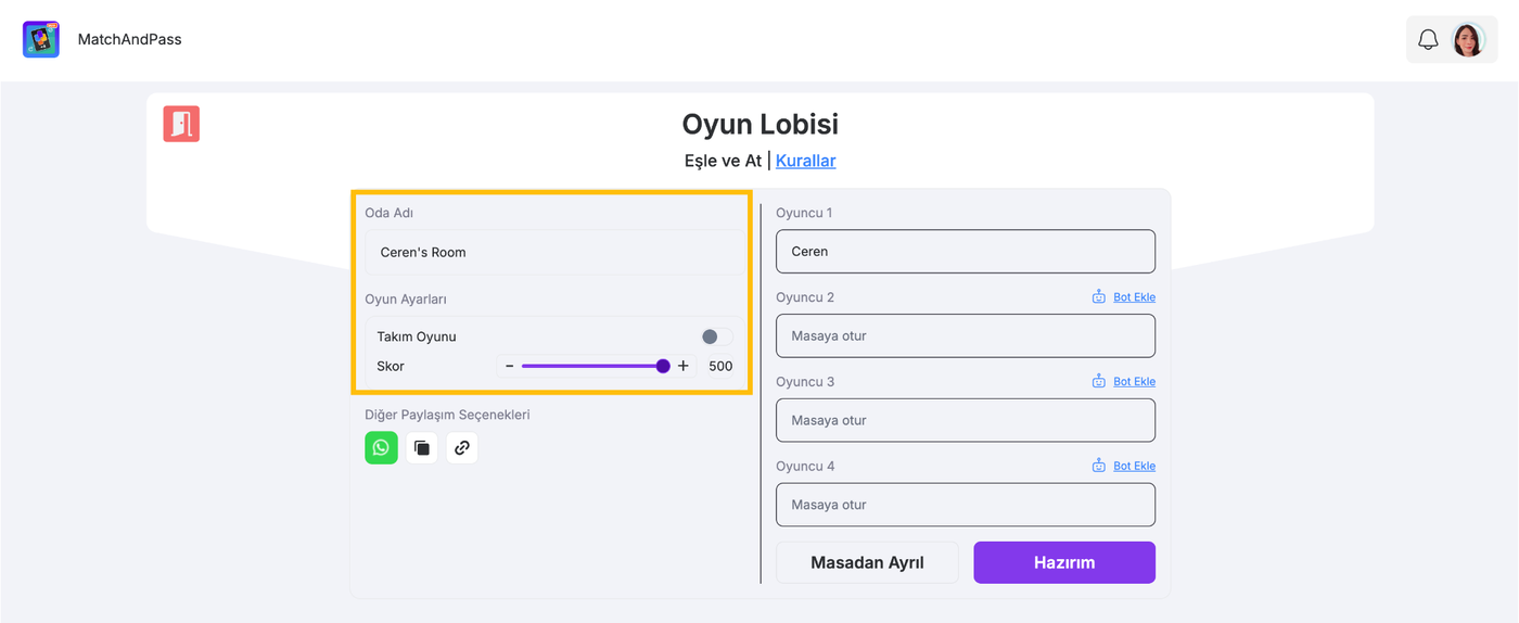 Oyun Oluştur: Yeni bir oyun odası oluşturup, arkadaşlarınızı davet edebilirsiniz.