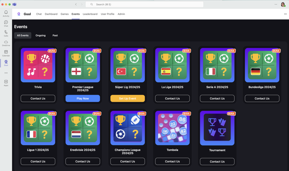 Guul’s events are designed to provide engaging, interactive experiences for different occasions, helping teams connect and boost participation in a fun way on Microsoft Teams. Ready to start organizing? Head to the Events tab to explore all available options!