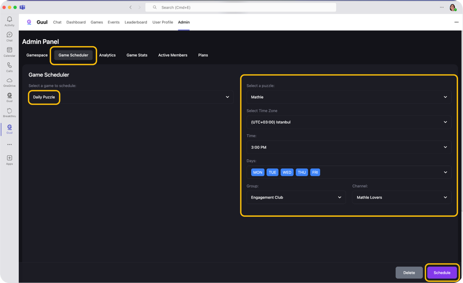 - Channel: Select the Teams channel you'd like to set. A new puzzle will refresh at the time you select, and a notification will be sent to your Teams channel. You can solve the puzzle directly from the notification.