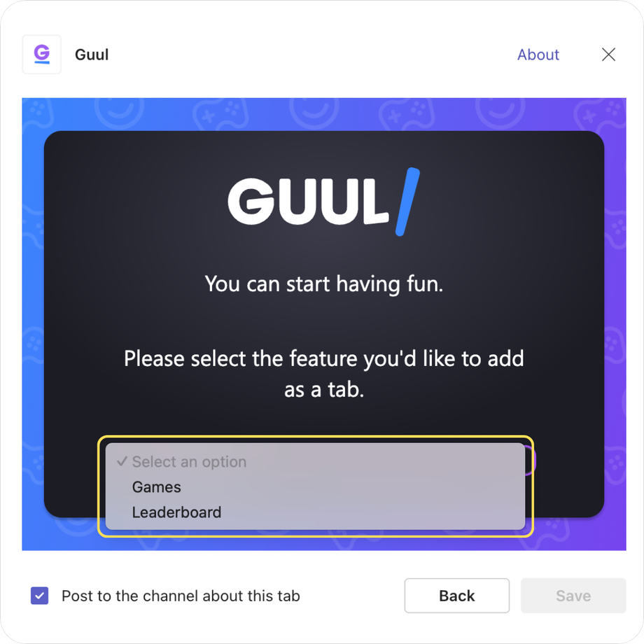 You can add Guul as a tab in the channel and include the game’s leaderboard so everyone can easily check the rankings.