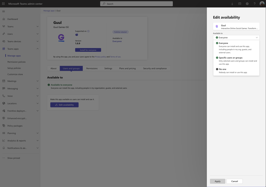 To ensure all intended users can access and interact with GUUL in Microsoft Teams, follow these steps in the Microsoft Teams Admin Center: