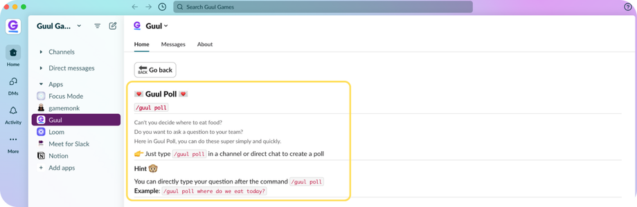 Step 1: Click on Guul from the Apps section in the left-side menu of your Slack workspace.