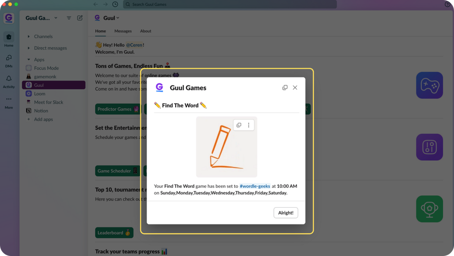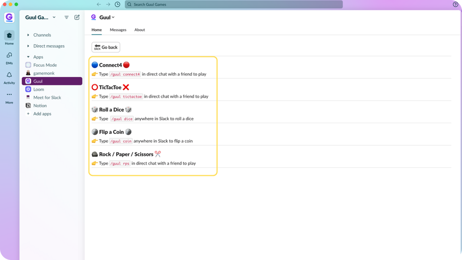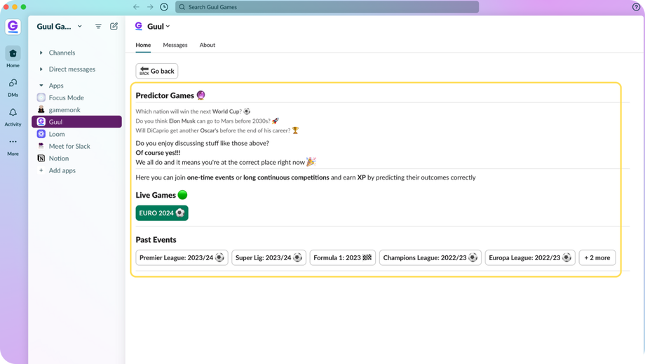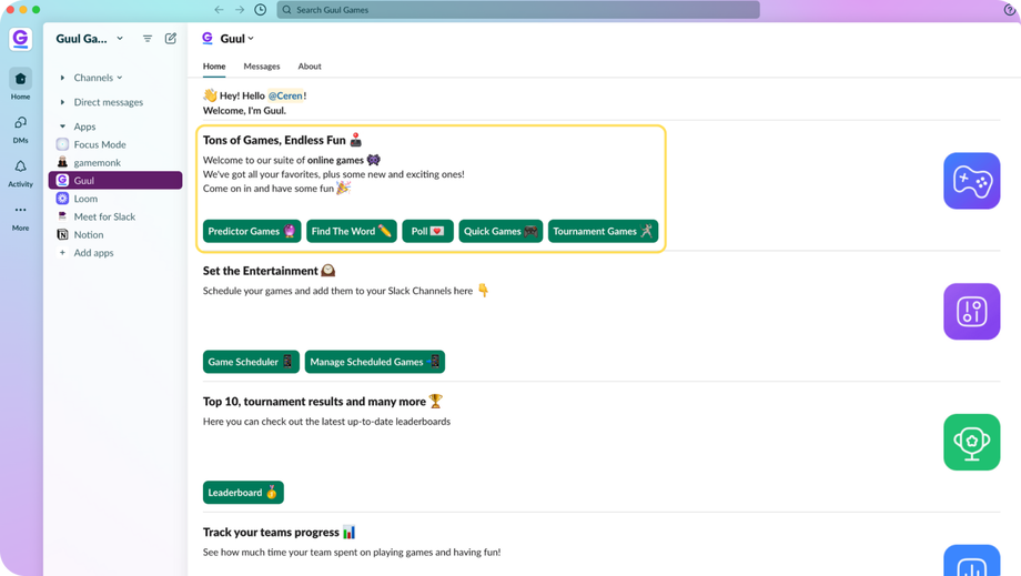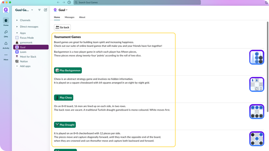 To explore all available games, visit the home page of the Guul app in Slack. Guul currently offers many social games and events designed to foster fun and engagement among users.