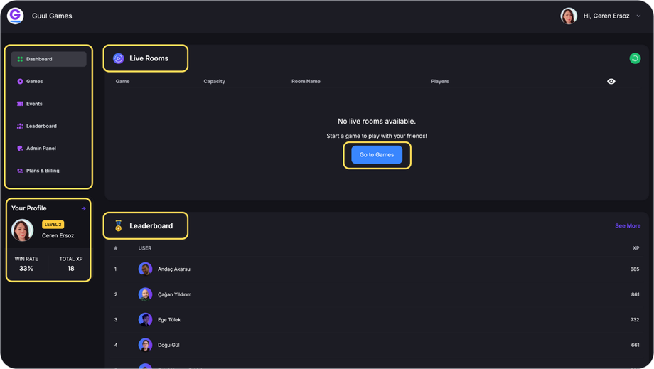 Once logged in, you can manage your Gamespace, schedule events, and track performance through the Guul web app. The dashboard on the website allows you to explore all the same features available in Slack.