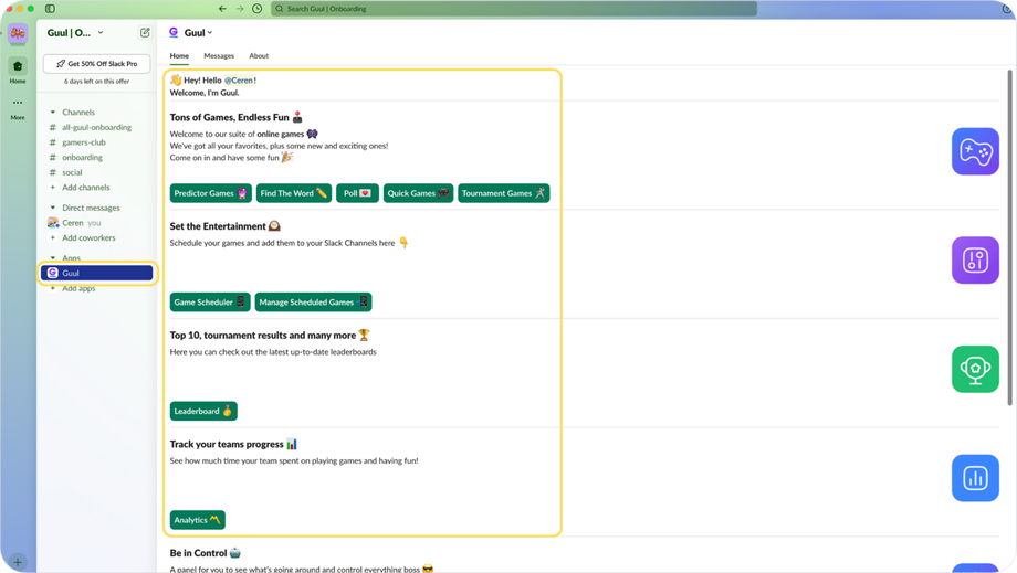 Go to your Slack workspace and click on Guul from the Apps section in the left-side menu.