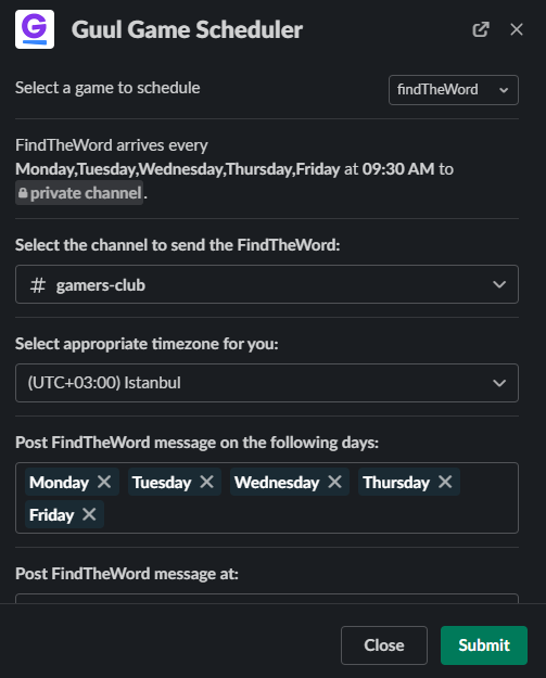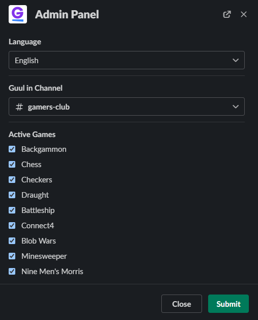 - By using the “Apps > Guul > Home > Admin Panel 👊” path, reach Admin Panel. You can choose Guul’s channel and active games to be played. This enables Guul Bot to send announcements and set up company-wide games (e.g. Find the Word, Score Predictor, etc.) For more detailed settings, visit Admin Panel on our web page.