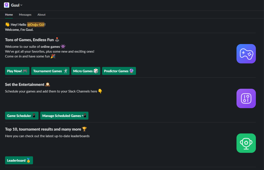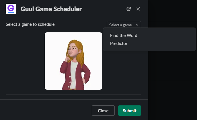 Find Guul App in your Slack Click on it and see the Home Page as follows Click to the “Game Scheduler 📱” section to schedule Company-wide Games. Choose your game from the dropdown menu. Select your game preferences and submit them to start engagement.